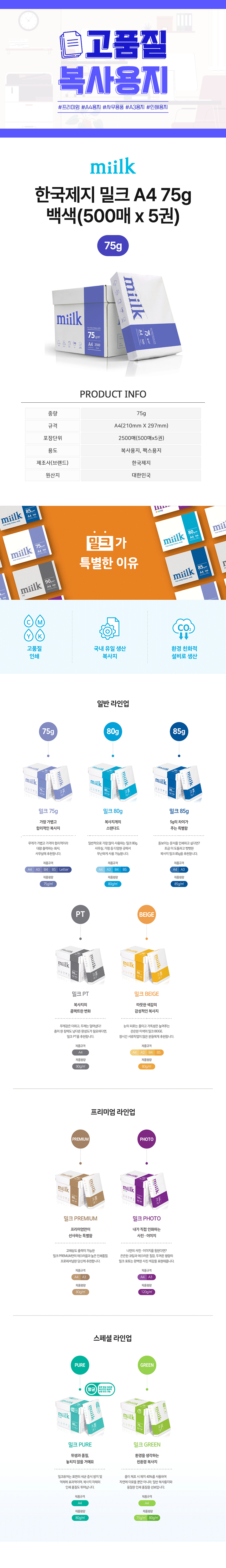 한국제지 밀크 A4 75g 백색(500매 × 5권)
