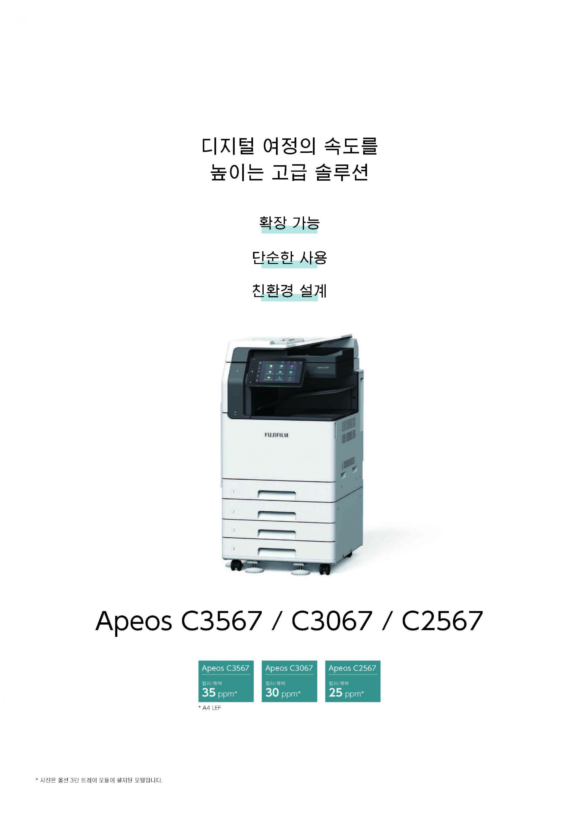 Apeos C3567 / C3067 / C2567은 직관적인 10.1인치 터치 패널과 강력한 보안 기능, 고속 스캔 성능을 갖춘 고성능 A3 컬러 복합기입니다.