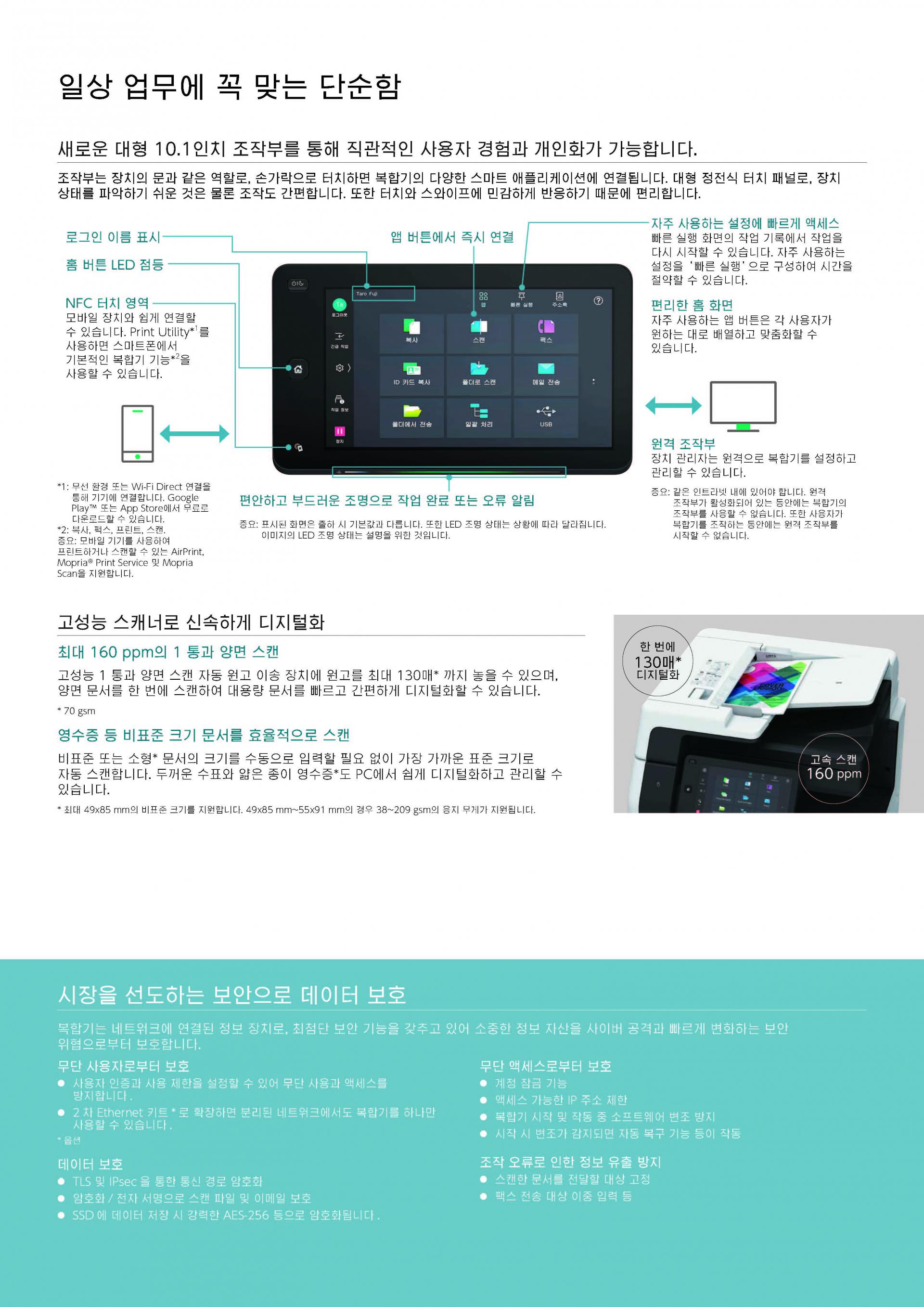- 스마트 스캔 & 문서 디지털화 : 최대 130매 급지 지원, 1Pass 양면 스캔으로 최대 160ppm 고속 처리, 문서 자동 분류 및 파일명 지정, Scan Delivery Light로 반복적인 스캔 작업 간소화