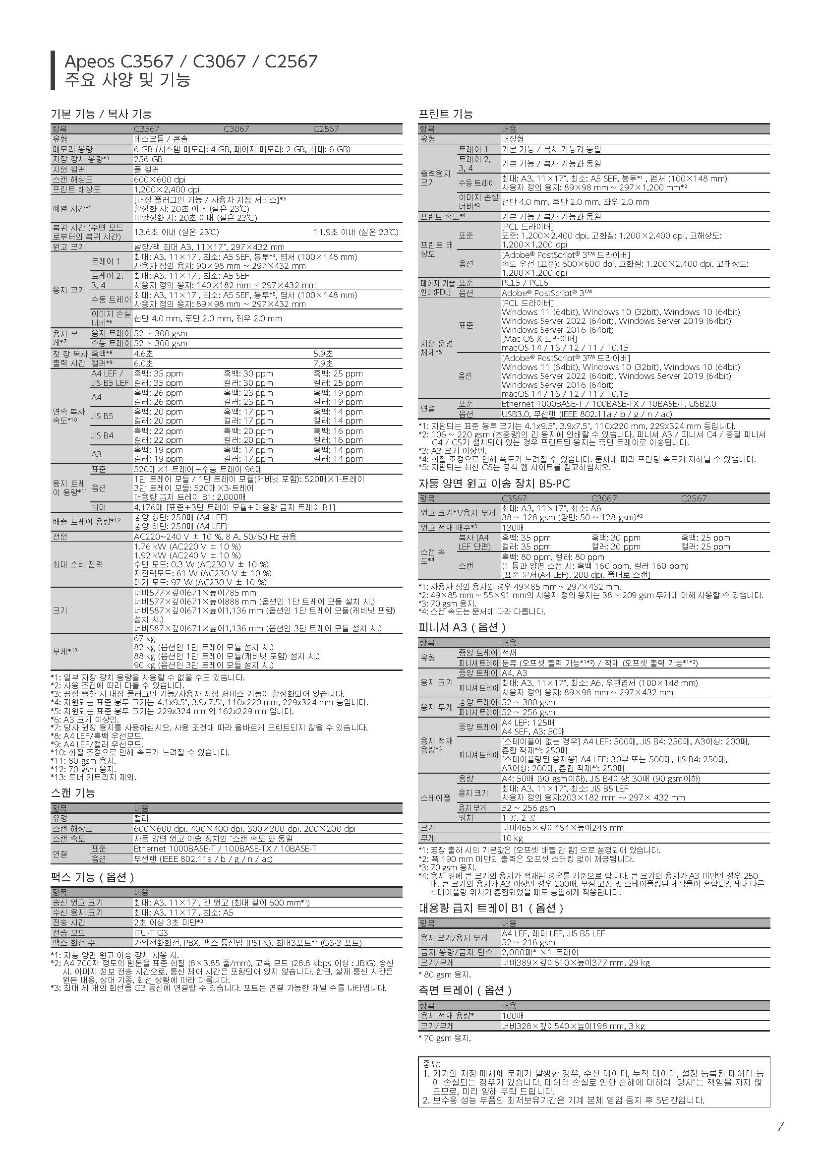 - 보안 & 관리 기능 강화 : 사용자 인증, IP 접근 제한, 계정 잠금 등 보안 체계, AES-256 데이터 암호화, TLS/IPsec 통신 보호, 원격 장치 관리 및 자동 소모품 배송, 클라우드 백업 서비스 지원