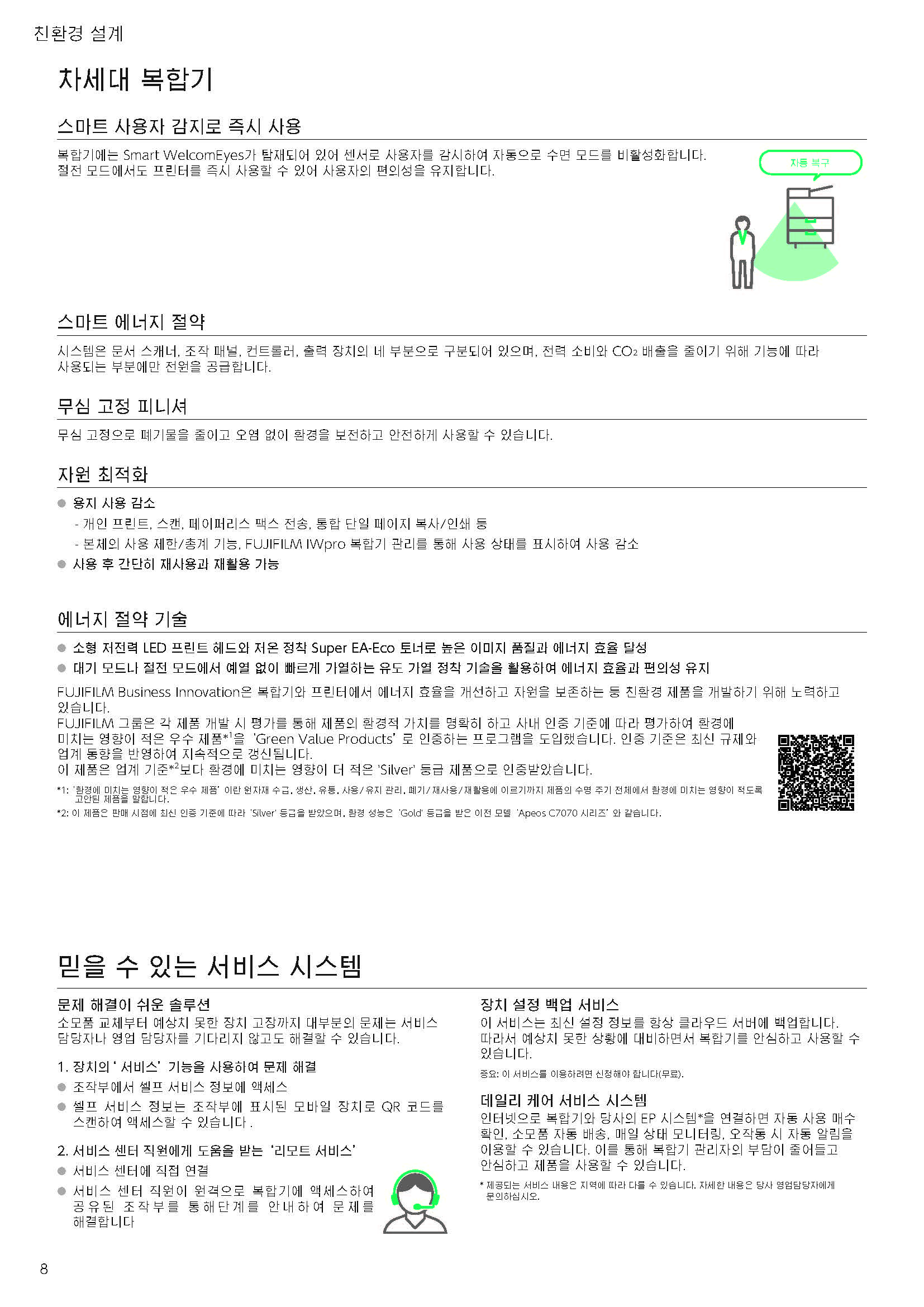 - 친환경 설계 : 저온 정착 기술과 절전 센서로 에너지 절감, Green Value Products ‘Silver’ 인증