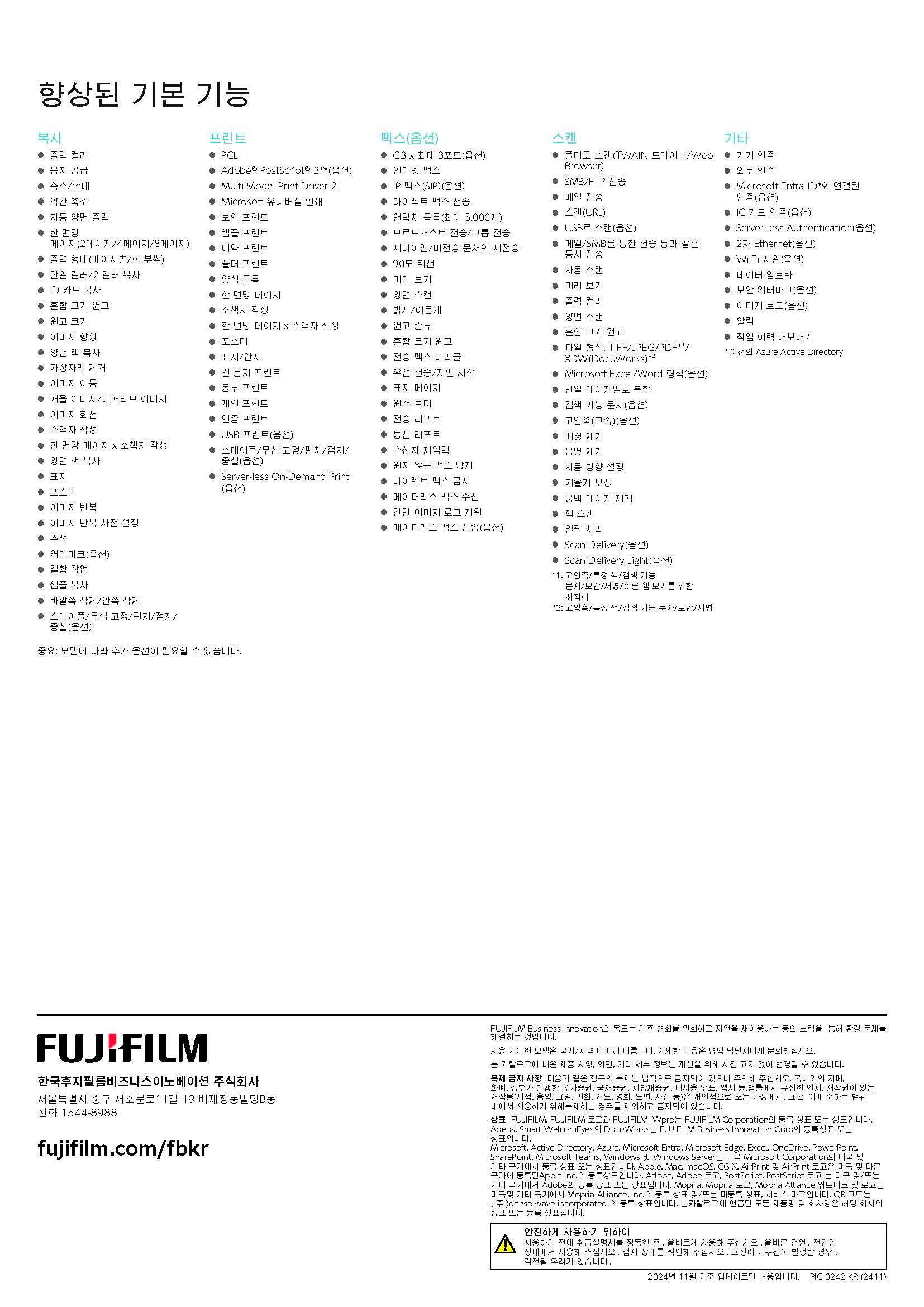 - 스마트 스캔·문서 : 관리 최대 250매 급지, 1Pass 양면 스캔 270ppm 자동 방향 조정, 빈 페이지 제거, 기울기 보정, 스캔 데이터 이메일·클라우드·네트워크 폴더 전송