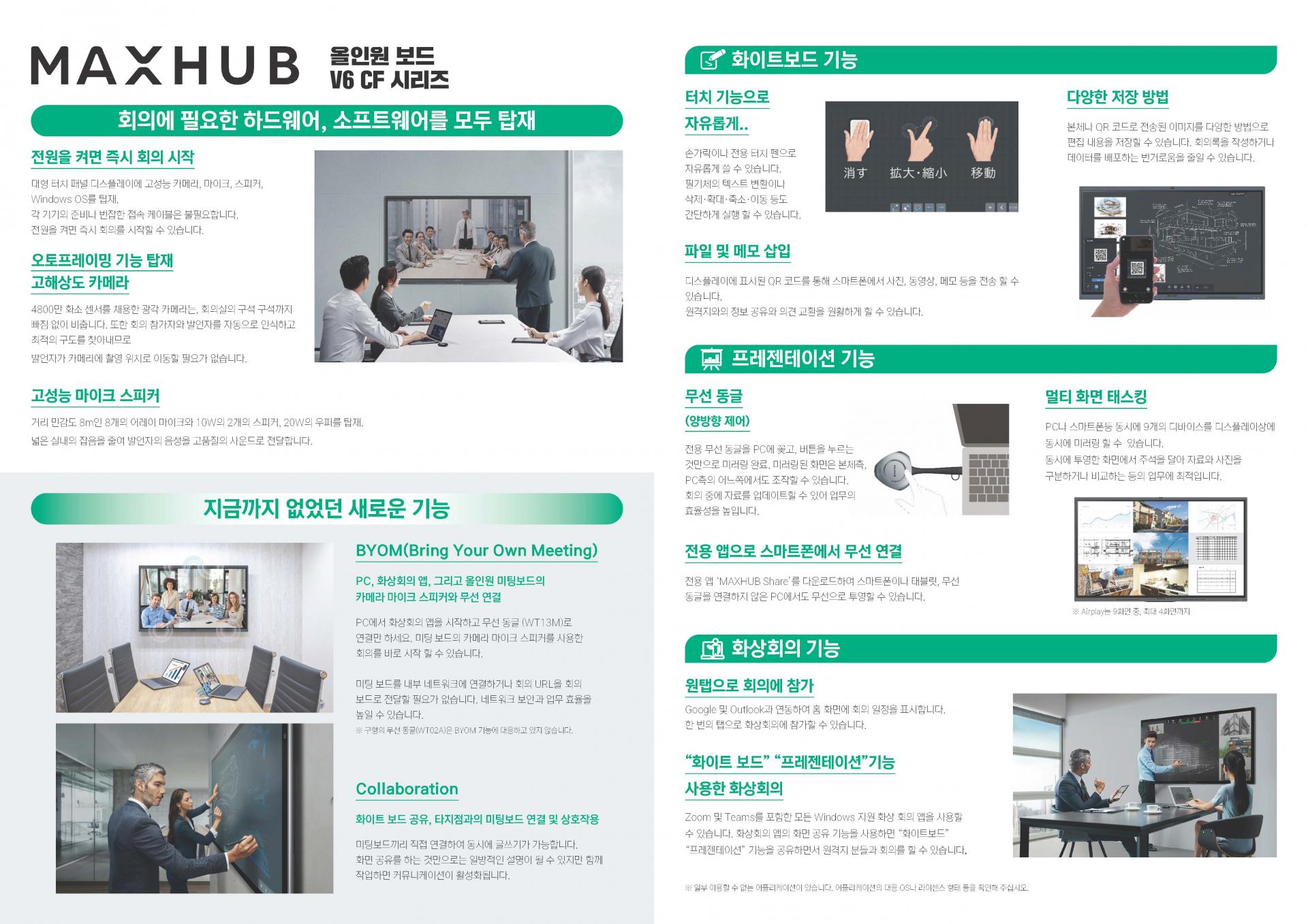- BYOM(Bring Your Own Meeting) : 무선 동글로 PC와 연결해 Teams, Zoom 등 원하는 회의 앱을 바로 사용.